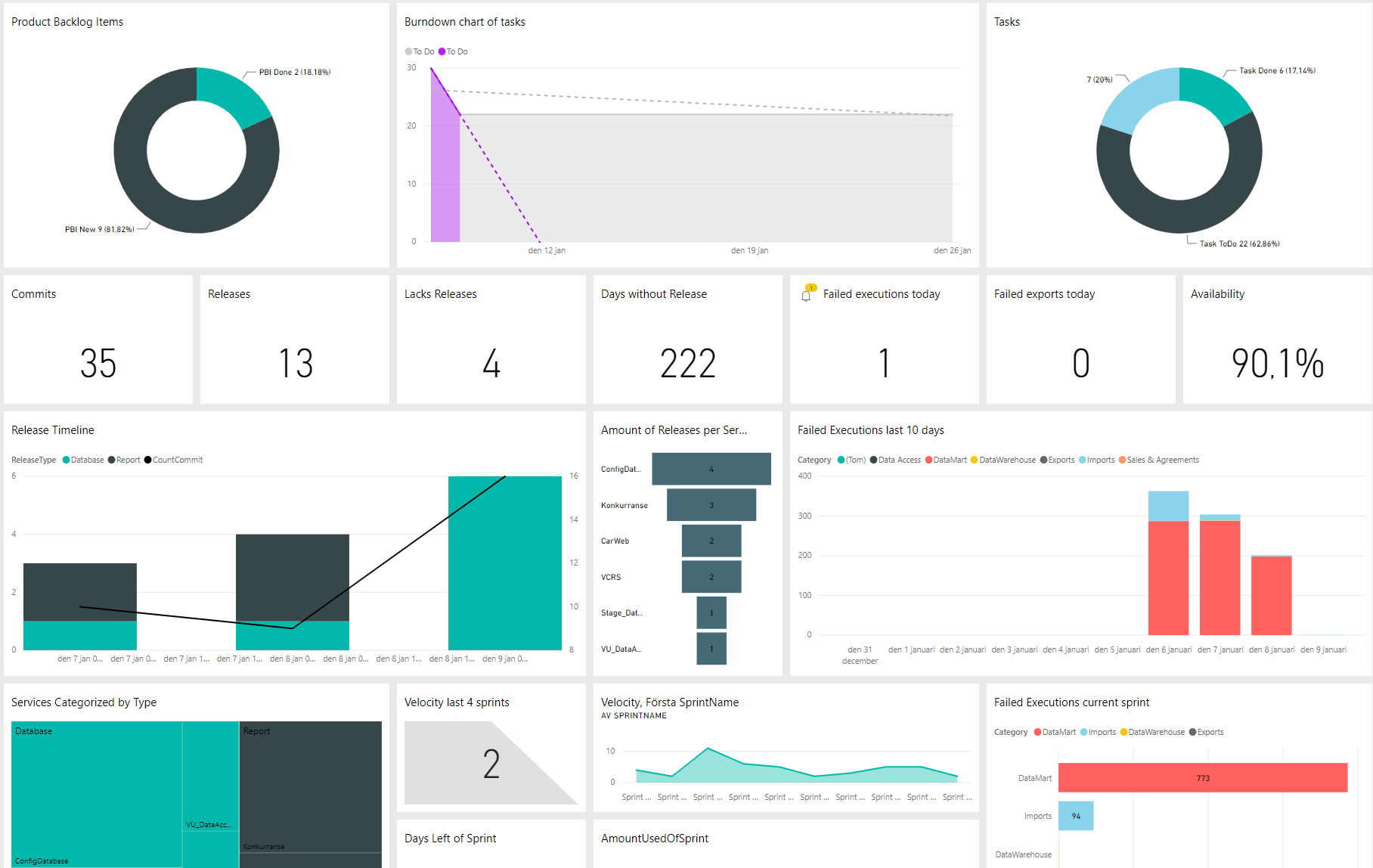 Kombinationen av Scrum Master och Business Intelligence utvecklare har satt mig i en unik positiopn att fram en lösning som kombinerar dessa två discipliner. Jag har utvecklat en PowerBI rapport som beslutsstöd för min roll som Scrum Mastere. Jag hämtar data från diverse källor och inkorpererar datat in till ett datalager som jag byggt. Visualiseringarna i rapporten ger mig både snabb överblick, övervaknining och drill frunktioner för att hålla reda på mitt team och produkt. Rapport som jag skapat fokuserar på 'throughput', 'sustainability', och 'sprint'. Det innebär att jag enkelt via dator eller mobil har kontinuerlig uppdatering på hur teamet ligger till i sprinten, hur många releaser som utförts, hur många service-ärenden teamet fått in, teamets sprint hastighet etc.